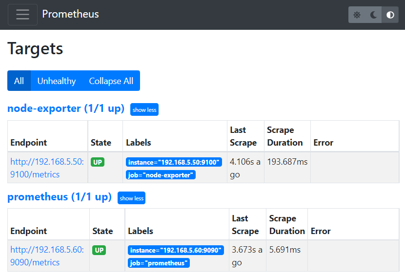 # Prometheus instance/server and the targets' IP and port are 192.168.5.60:9090